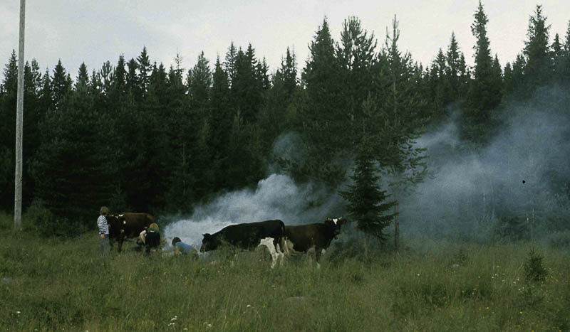 Sedan när det börjar ryka så kommer korna till röken för att bli fri från myggen.