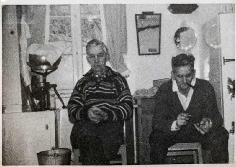 Det är Ossian som sitter till vänster. Uno Oderhall, personen till höger, bodde i Annevare. Ossian var alltså gift med Signhild men hon levde inte 1970 när fotot togs hos Ossian. Däremot fanns ett foto av henne i Anna-Britts fotoalbum.